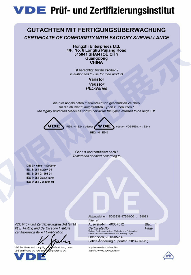 廣東鴻志電子科技有限公司成立于1993年,位于美麗的海濱城市汕頭,現(xiàn)已發(fā)展成為元器件制造集團企業(yè),生產(chǎn)壓敏電阻、NTC熱敏電阻、陶瓷電容和金屬化薄膜電容,通過了ISO9001質(zhì)量體系認(rèn)證和ISO14001環(huán)境體系認(rèn)證,以及IATF16949汽車產(chǎn)品質(zhì)量體系認(rèn)證...